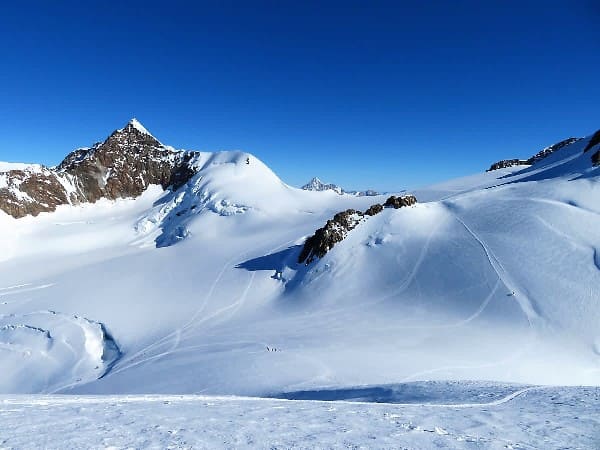 Télécabine matinal pour le Passo Salati (2980m), puis téléphérique pour Indren (3260m). Mise des peaux pour monter au refuge Mantova (3498m). Nous monterons sous la Pyramide Vincent pour atteindre la barre des 4000 sous le Balmenhorn (4167m). De là au choix selon la météo et la forme des participants, nous pourrons gravir un ou des sommets de plus de 4000 mètres : Pyramide Vincent (4255m), Balmenhorn (4167m), Ludwigshöhe (4342m) Signalkuppe ou Punta Gnifetti (4554m) où se dressent la cabane Margherita. Descente plus ou moins par l’itinéraire de montée, avec une pause au refuge Gnifetti ou Mantova s’ils sont ouverts, puis poursuite de la descente à Gabiet. De là, à skis par la piste jusqu’à Stafal. Séparation à Gressoney Staffal vers 15 heures.